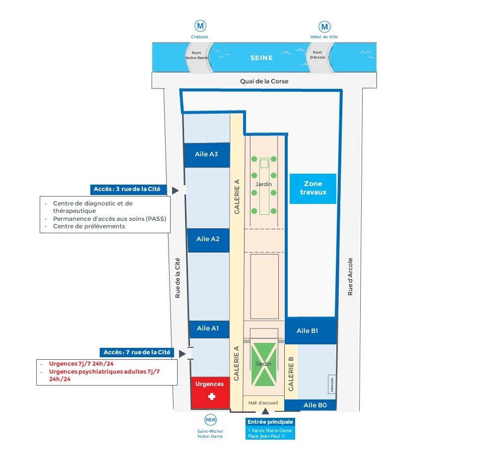 L’hôpital Hôtel-Dieu est situé 1 place du Parvis Notre-Dame, dans le 4e arrondissement de Paris. Il se trouve à 3 minutes à pied du métro Cité.